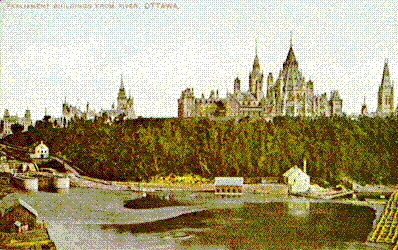 The first photo above, No. 22378 The Parliament Buildings, Ottawa, Ontario as seen from Nepean Point was taken by Robert Bell, head of the Geological Survey of Canada, in 1884. I found it on-line at http://www.nrcan.gc.ca/ess/esic/photojpeg/22378.jpg. The Herm. Brosius "Bird's Eye View of the City of Ottawa" of 1876, the poorly executed engraving of Barrack's Hill in The Illustrated London News - April 25 1857, the Rideau locks in W.S.Hunter Jr. "Ottawa Scenery" of 1855, and the Picturesque Canada engraving may be found on pages 39, 26, 86 and 118 respectively of Ottawa, A Pictorial Record by Charles P. deVolpi. The "Bird's Eye View" identifies many other mills illustrated by the picture but not the one I write about here. The Ottawa Room of the Public Library has insurance maps from long ago Ottawa but these exclude for some reason the Parliament Hill area and this mill. Look at page 24 of Hurling down the Pine by John W. Hughson and Courtney C.J. Bond for a photograph with clear details of the intriguing stacking yard on the west side of the mill as well as for the best history of steam and watermills in the district. The National Archives of Canada photograph PA-12382 by William James Topley shows the mill as well as the boat dock below Nepean Point. The Charlton Standard Catalogue of Canadian Government Paper Money 4th edition has the 1900/1902 $4 bill on page 116. The postcard is from the Postcards of Ottawa book. The pictures of the mill shown with Parliamentary Library are quite common. Les Bienheureux Martyrs de la Compagnie de Jésus au Canada by The Révérend Père Frédéric Rouvier, S.J. (1925 Montreal) has a well-done sketch on page 42.
