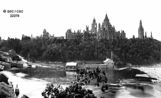 It may seem odd that permission would be granted to build a steam mill below Parliament Hill where, just a few years earlier, the greatest neo-gothic monument in North America, the Canadian House of Parliament was built. A smokey vulgar steam-powered lumber mill, noisily sawing wood and spewing sawdust was set right below our national parliament! The first Prime Minister Sir John A. MacDonald held that there should always be industry within view of Parliament Hill to reinforce the impression of the hard-working nature of Canadians. Was this symbolic consideration the basis for the permission given by the planners of the national capital to build the mill?