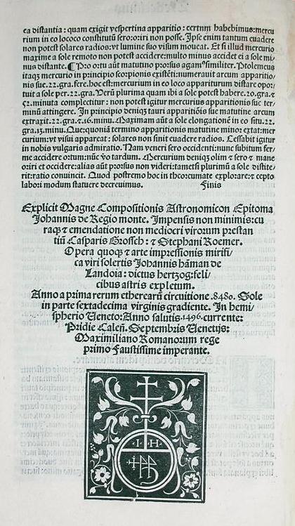Le colophon rassemble à la fin du volumede nombreuses indicationsbibliographiques: nom de l'auteur et du traducteur, nom de l'imprimeur ou du libraire, ville ou l'ouvrage a été imprimé, date d'impression. Tous ces renseignements sont établis en d'intéressantes contructions typographiques. Vous pouvez admirer ici le colophon publié dans l'ouvrage de Galilée publié en 1496 portant sur l'astronomie et Ptolomée. Vous pouvez consulter tout ce volume en ligne Astronomy: Regiomontanus, Epitome of Ptolemy’s Almagest